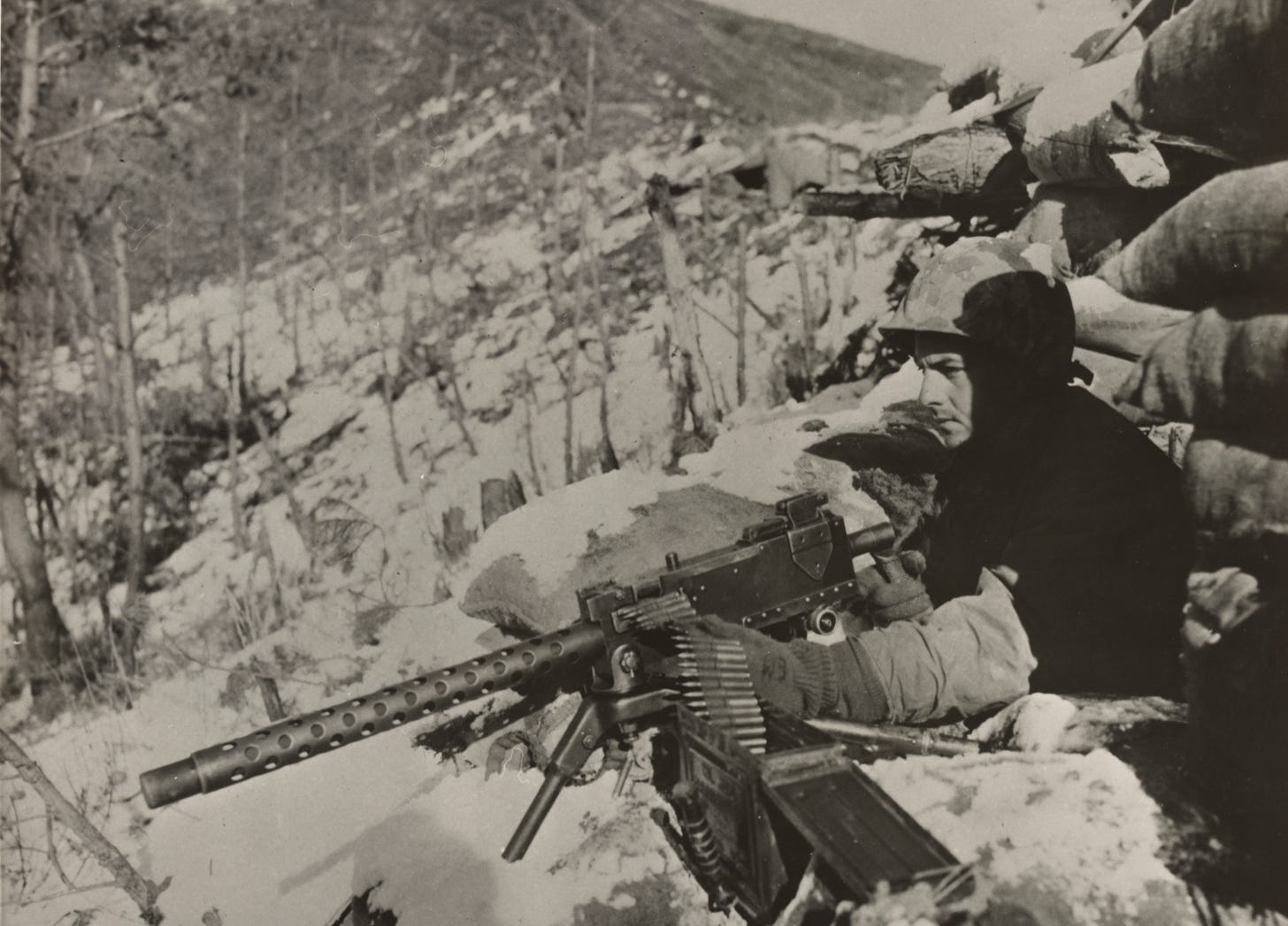 In 1945, the designers of the G-Series tables of organization abolished the weapons companies of infantry battalions. At the same time, they provided each rifle company with the means of employing as many as many as twelve tripod-mounted machine guns at any one time. (Under normal circumstances, the one machine gun platoon of each rifle company carried six air-cooled Brownings. When, however, a rifle company took up a defensive position or took part in a deliberate attack, its machine gun platoon drew six extra tripod-mounted machine guns, all of which were water-cooled Brownings.)