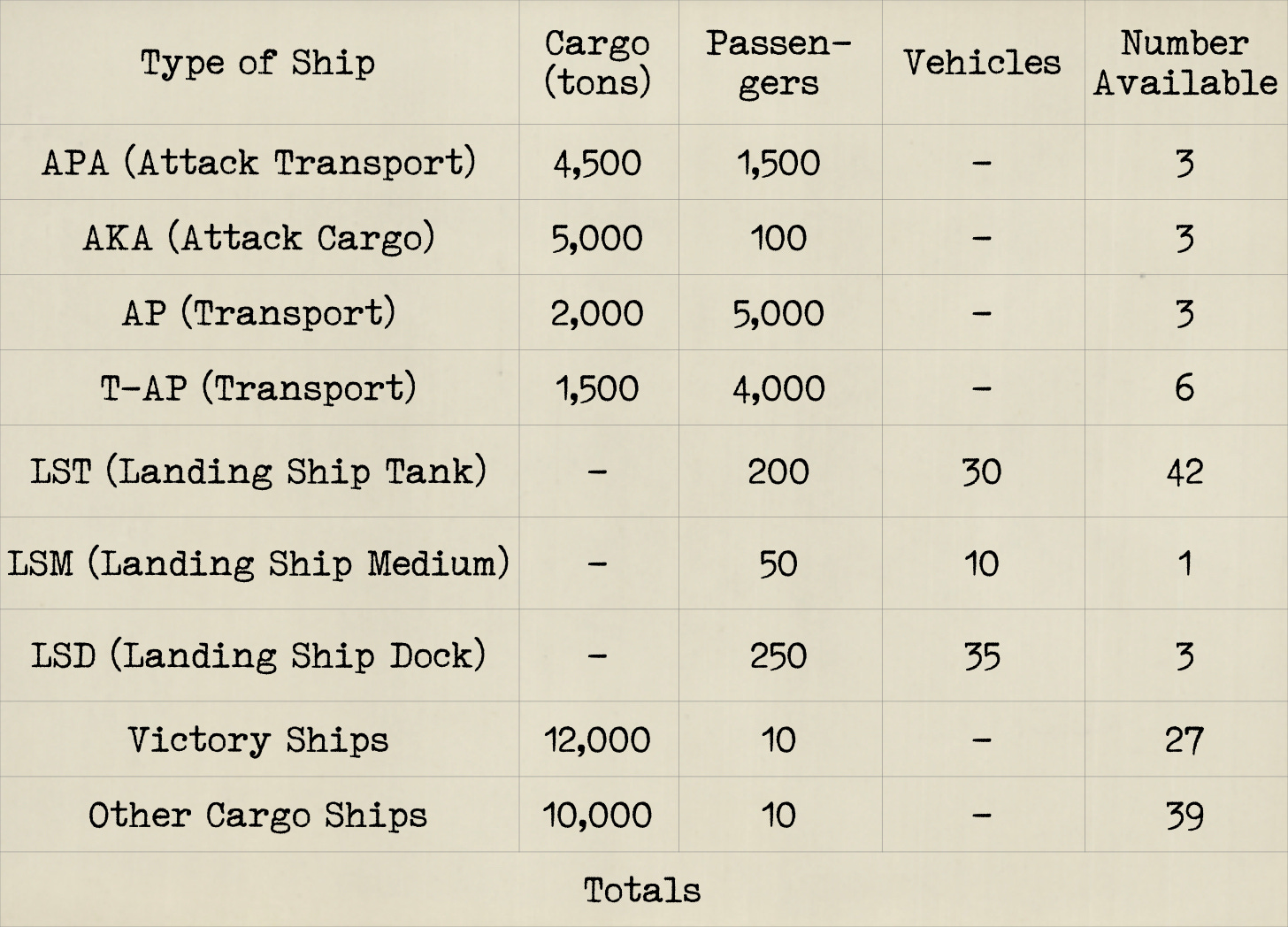 The naval forces of the United Nations Command has placed a number of cargo ships at your disposal. (Nearly all of these were built in the United States during the Second World War. Of these, however, many spent the last few years in the inventories of Japanese shipping companies.)