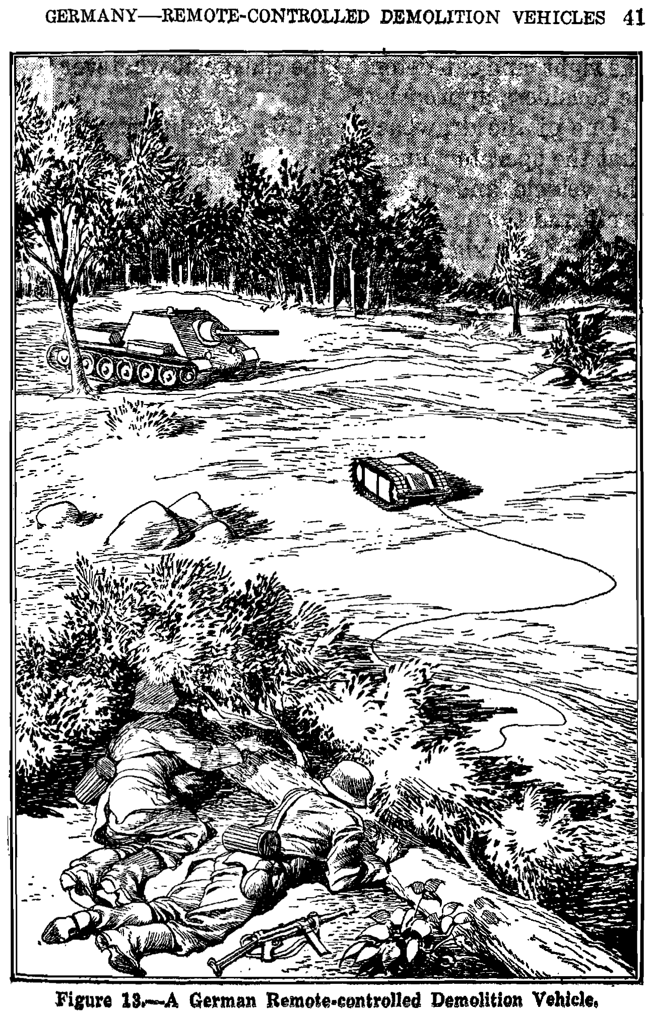 One of the drawbacks of this demolition vehicle is that the operator must have direct observation both on the vehicle and the target. It is believed that the preferred German method of operation is to direct the vehicle in a zigzag manner toward its target. The vehicle cannot travel over very rough terrain, and is definitely vulnerable to small-arms fire.
