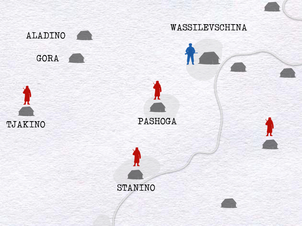 The Ski Company (Lieutenant Boeck) departs Wassilevschina at 0100, moving to the west in order to take possession of the hill 500 meters NW of Pashoga. This done, the Ski Company awaits the order to attack the southwest edge of the village. While waiting, the Ski Company will send a patrol in the direction of Tjakino.