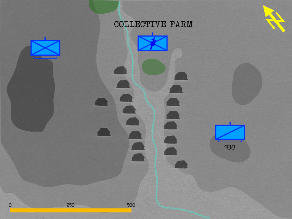 The Reconnaissance Company (Lieutenant Count Kottulinsky) departs Wassilevschina at 0100, moving to the south, along the south edge of the woods, in order to take possession of Hill 188. This done, the Reconnaissance Company awaits the order to attack the southeast edge of the village. While waiting, the Reconnaissance Company will send a patrol in the direction of Stanino.