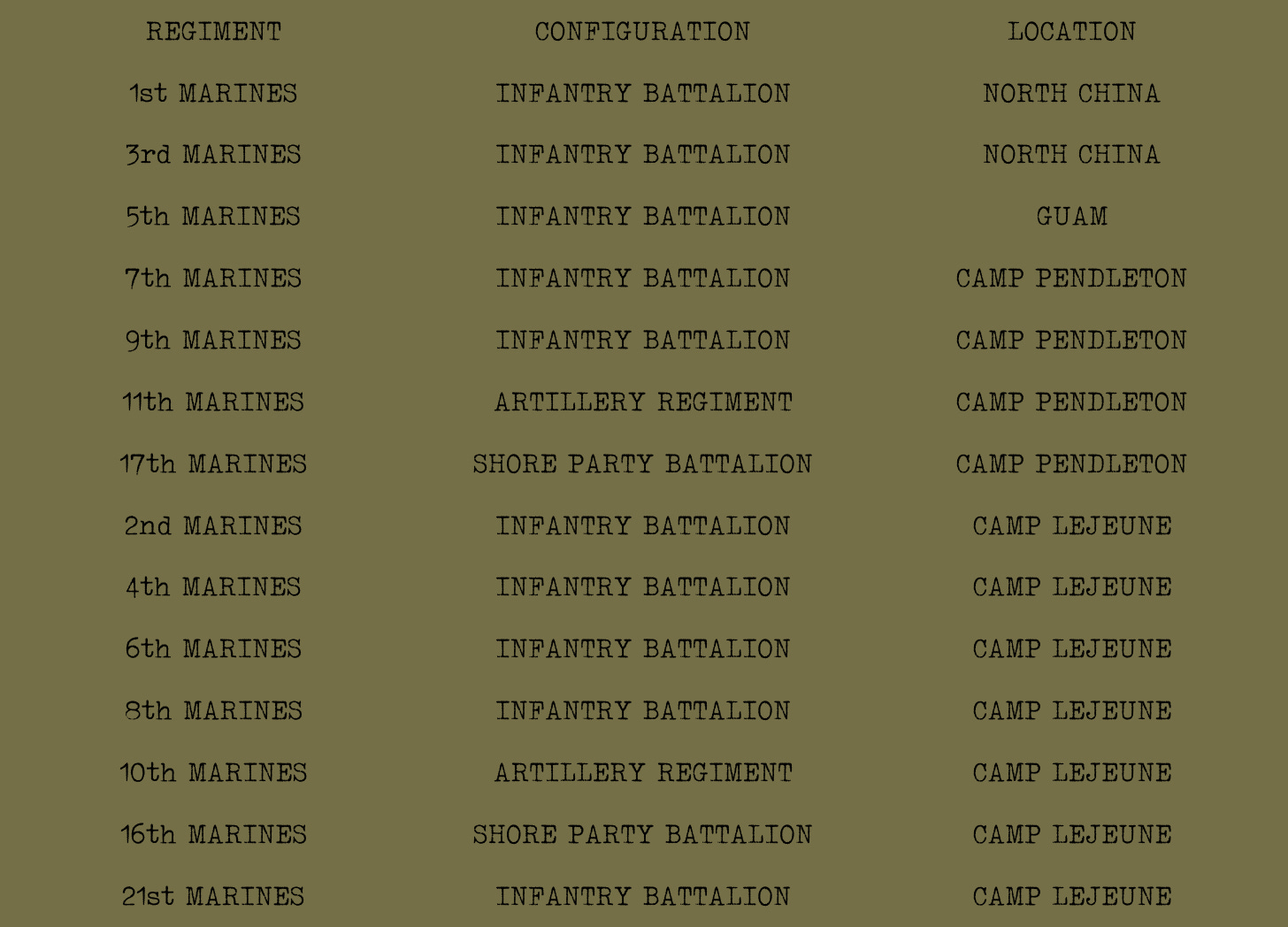 Two of the three remaining regiments were serving in China, in support of the (Quixotic) attempt to broker a peace between Nationalists and Communists. The last could be found on the island of Guam.