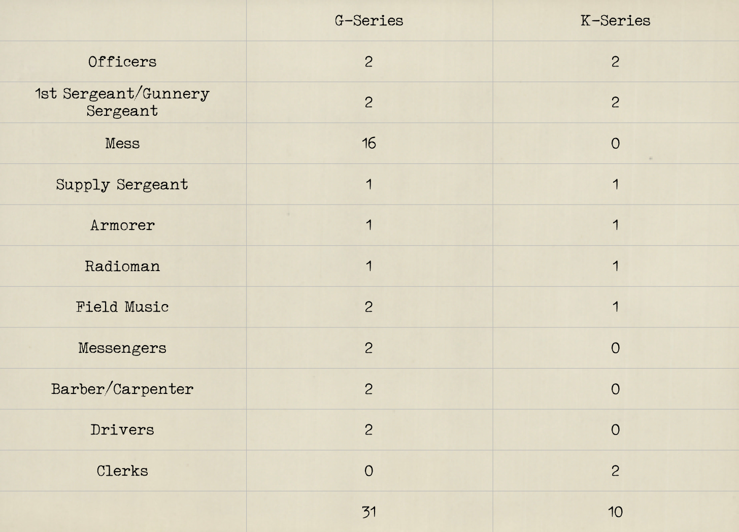 For the most part, the reduction in the size of the headquarters section resulted from the transfer of twenty-one Marines to the headquarters and service company of each battalion. In other words, it resulted from the transfer of certain support functions, from the making of meals and the driving of jeeps to the cutting of hair and the sawing of wood, to the battalion level. (By the way, this centralization of cooks, drivers, barbers, and carpenters was one of the few innovations of the J-Series establishments that the authors of the K-Series establishments decided to retain.)