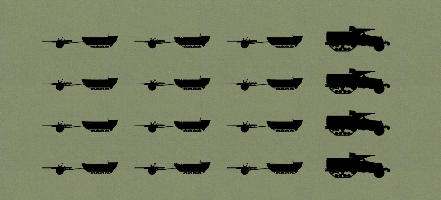 The first wave of the landing consisted of armored amphibious tractors, each of which sported a 75mm howitzer. The next four waves, also in armored amphibians, carried the two forward battalions. The fifth wave, mounted in Higgins boats, included two of your three anti-tank platoons, all four of your 75mm field guns, your company headquarters, and you. (The third anti-tank platoon has been attached to the reserve battalion.)